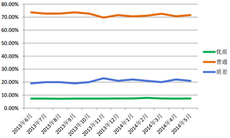 2、從近一年的評(píng)估數(shù)據(jù)中我們發(fā)現(xiàn),優(yōu)質(zhì)網(wǎng)頁的絕對(duì)數(shù)量非常少,且?guī)缀鯖]有增長;普通網(wǎng)頁的占比在下降,相應(yīng)的,質(zhì)差網(wǎng)頁的比例卻有明顯上漲。