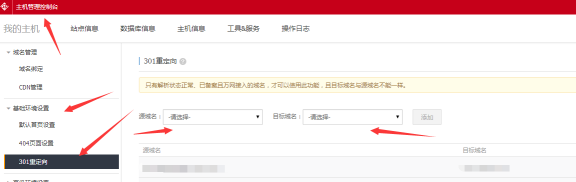 其實很簡單,打開網(wǎng)站空間主機(jī)管理后臺,找到301重定向操作,如圖: